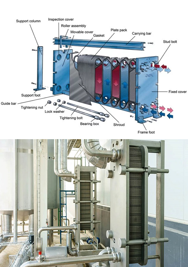 - PHE Plates and gasket: The plate pack is assembled between a stationary frame plate and a pressure plate and compressed by tightening bolts fitted between these two plates. The channel plates and the pressure plate are suspended from an upper carrying bar and located by a lower guiding bar.